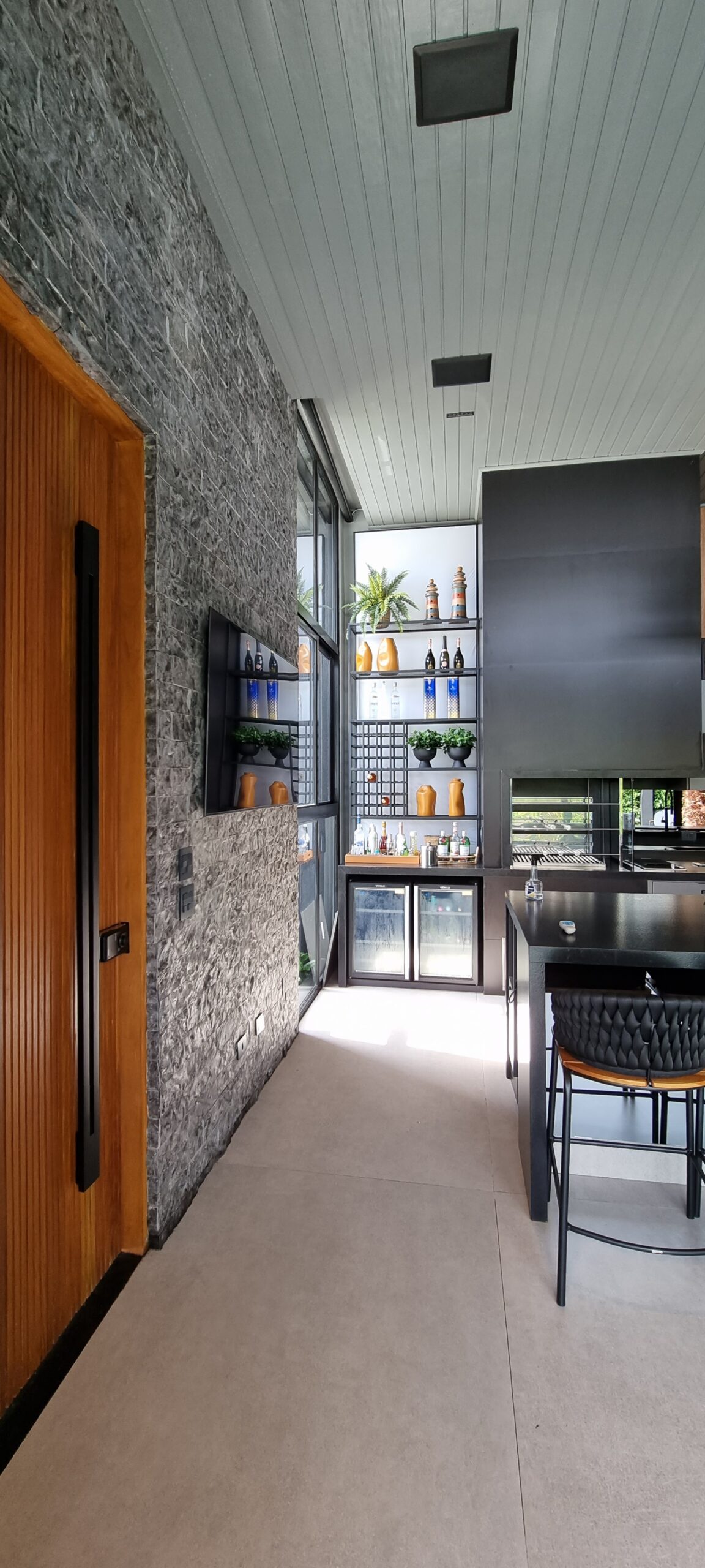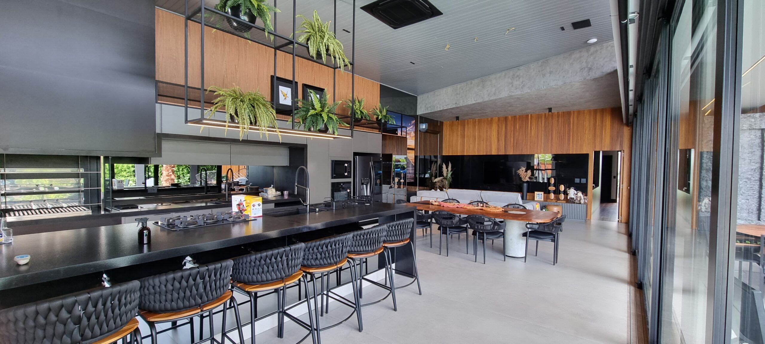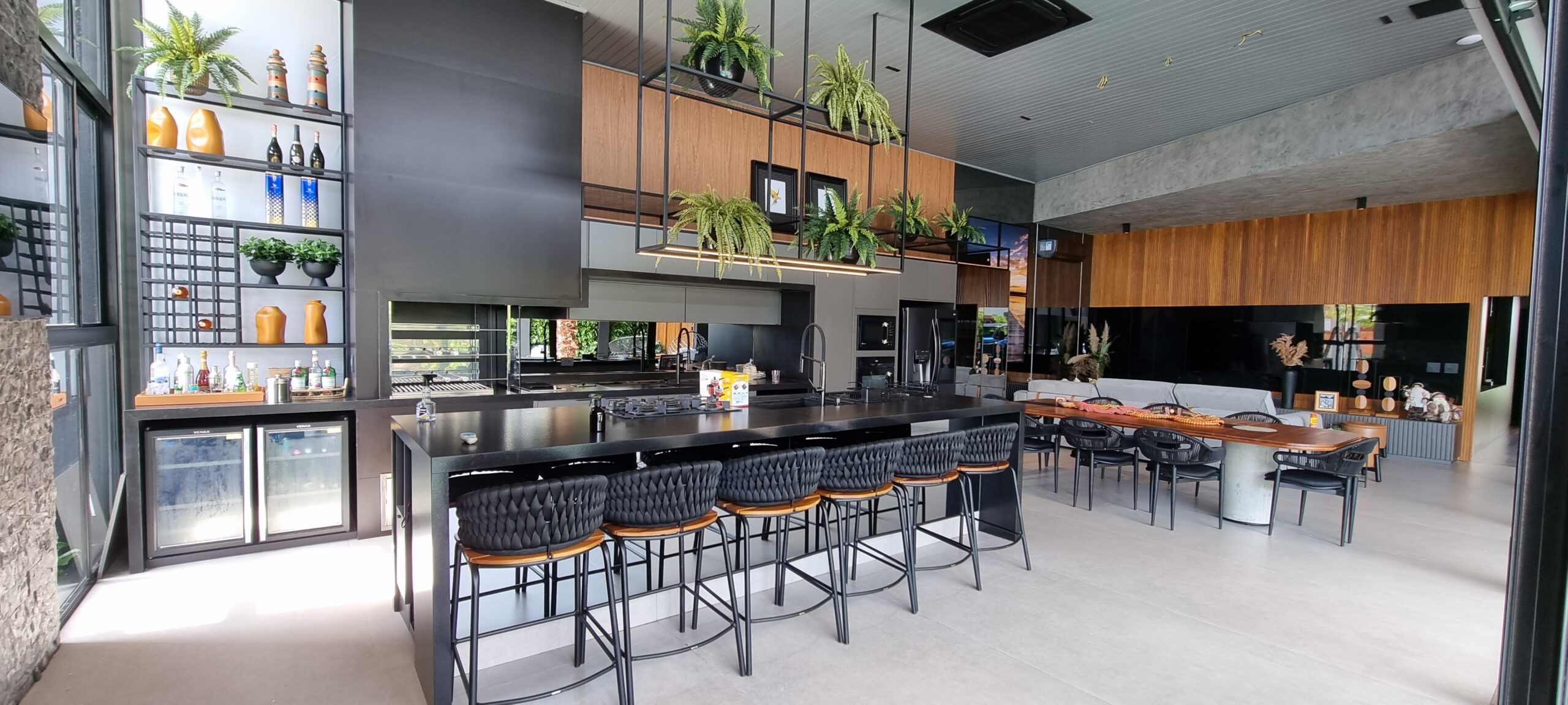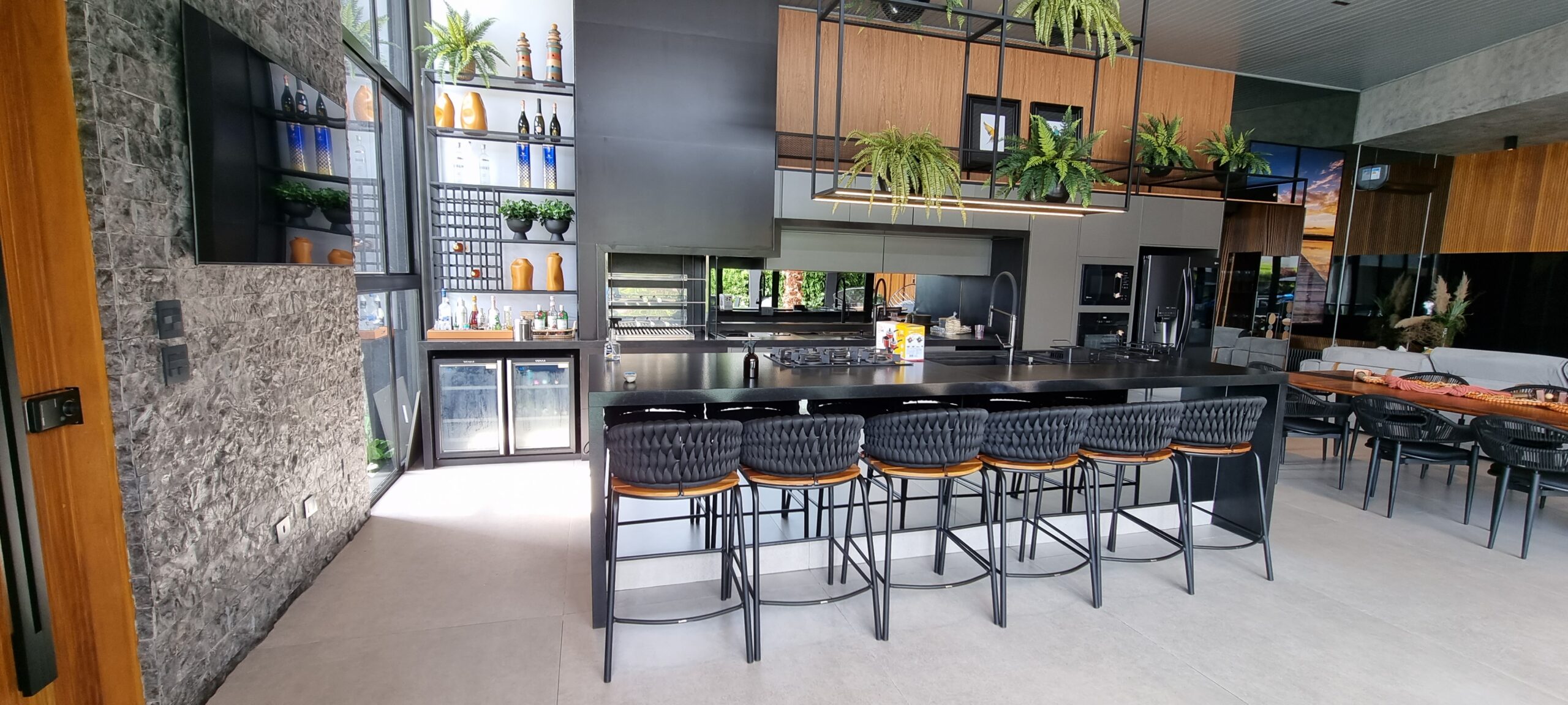 Ao lado da piscina está a riquíssima área gourmet, equipada com bancada com tampo de mármore, móveis de qualidade impecável e eletros de última geração. A decoração alterna tons terrosos e escuros. Há também uma mini adega para vinhos e afins, churrasqueira em inox e design interior q segue o conceito aberto. Esse espaço é separado da área externa por uma “parede” modular de vidro temperado com abertura total, deixando o acesso entre os ambientes interno e externo, totalmente livre.