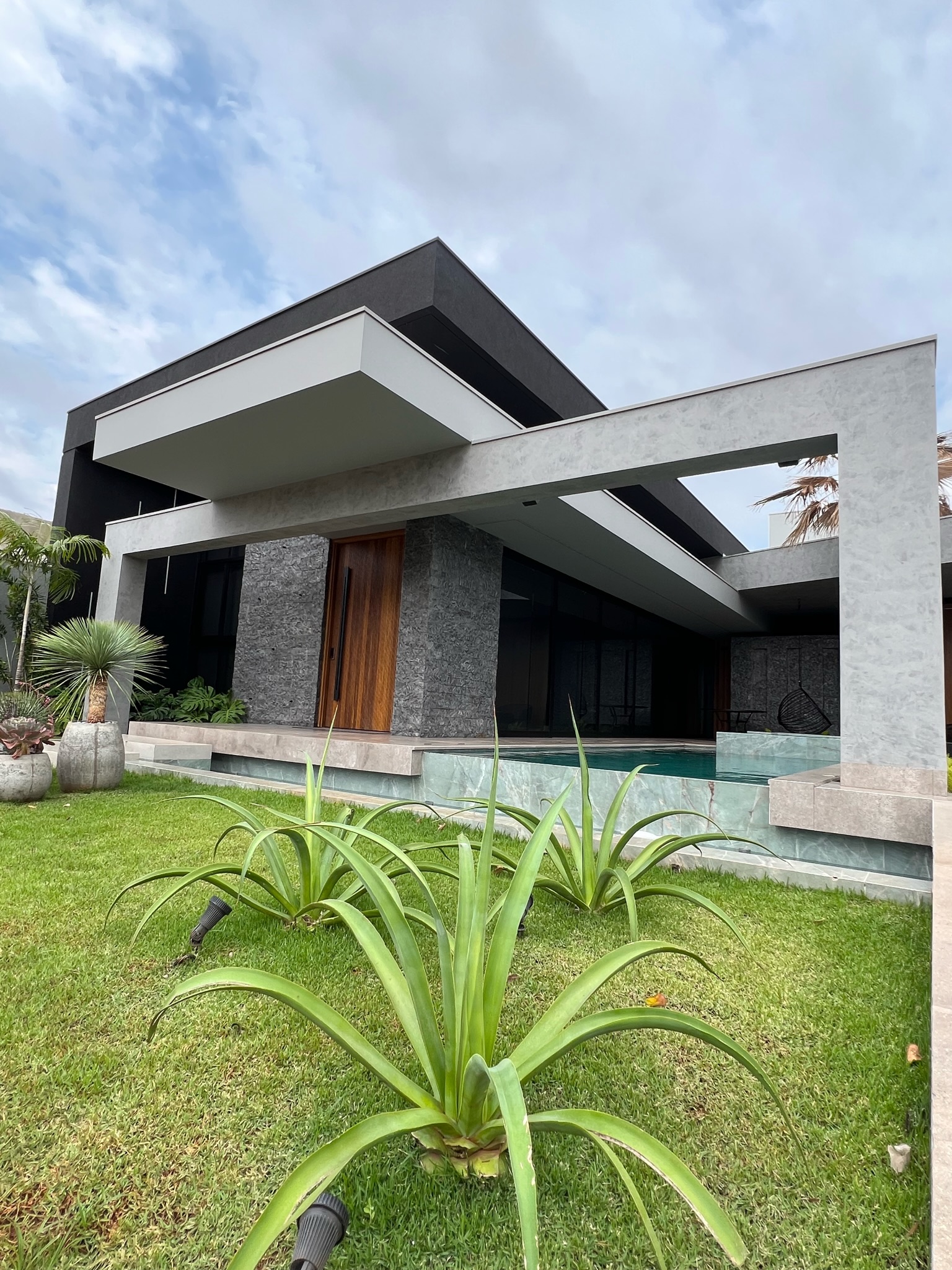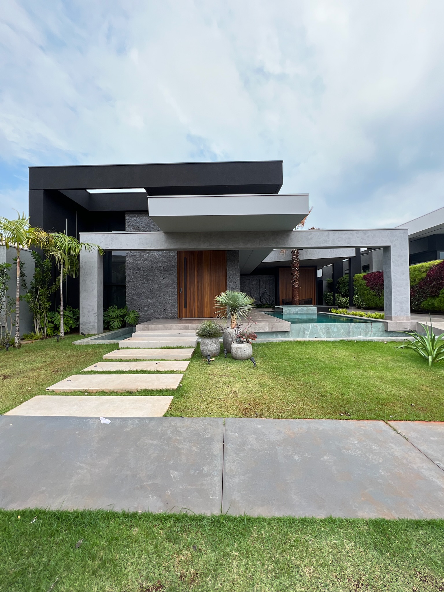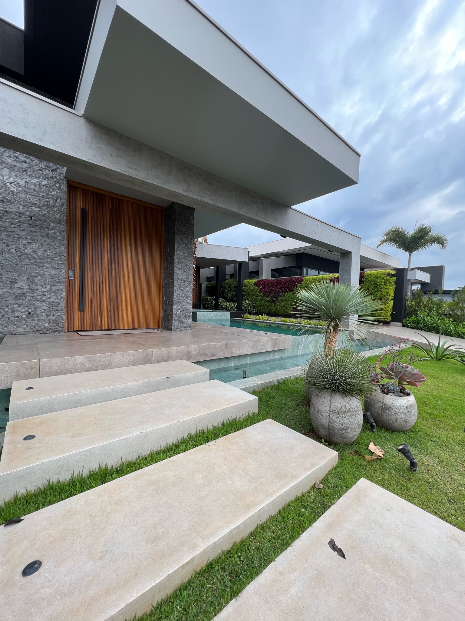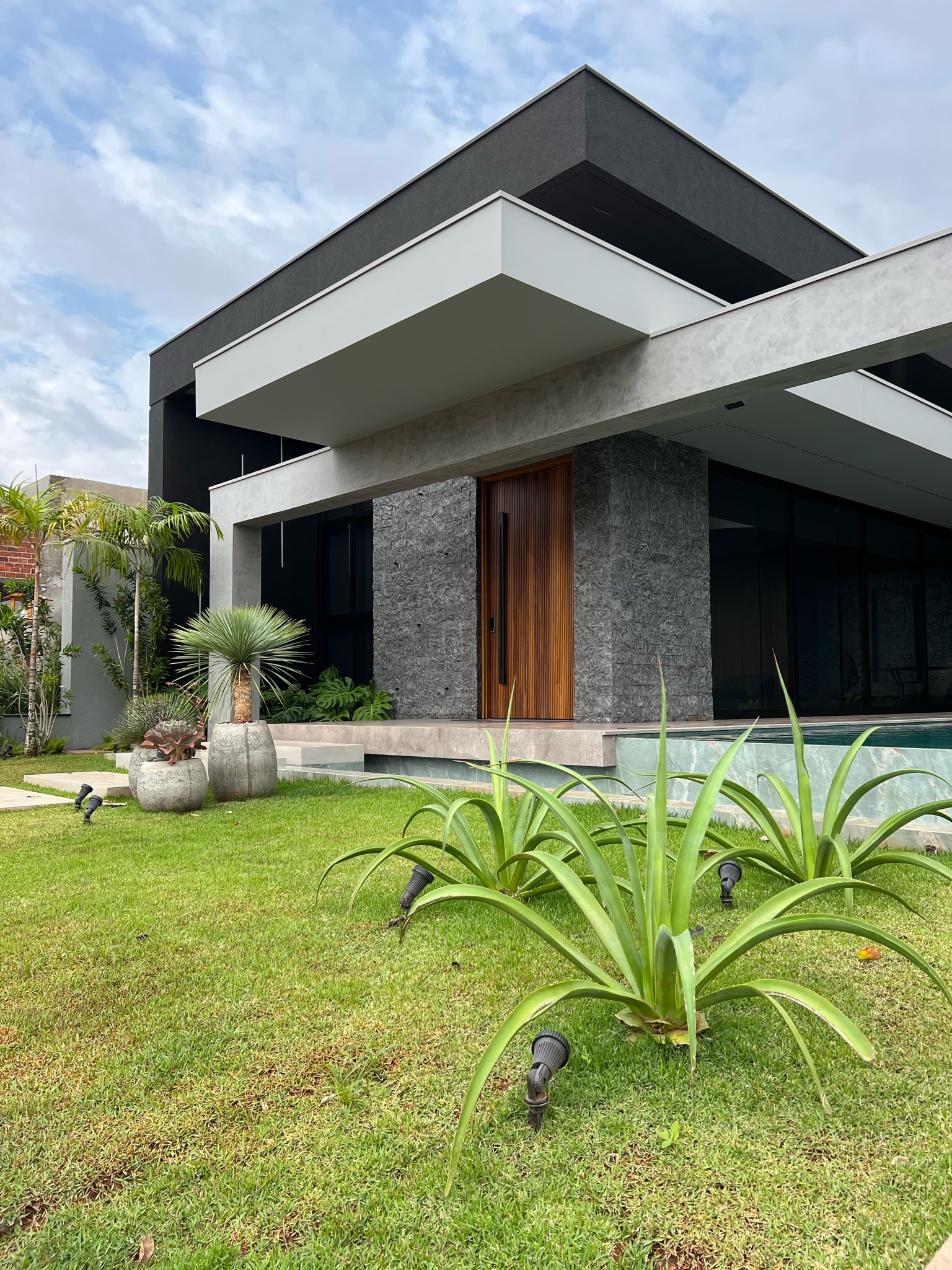 A fachada em linhas retas com tons e texturas contrastantes é de extremo bom gosto. Uma combinação plena entre o urbano e a natureza, proporcionada pela estrutura singular e pelo paisagismo aplicado à construção.